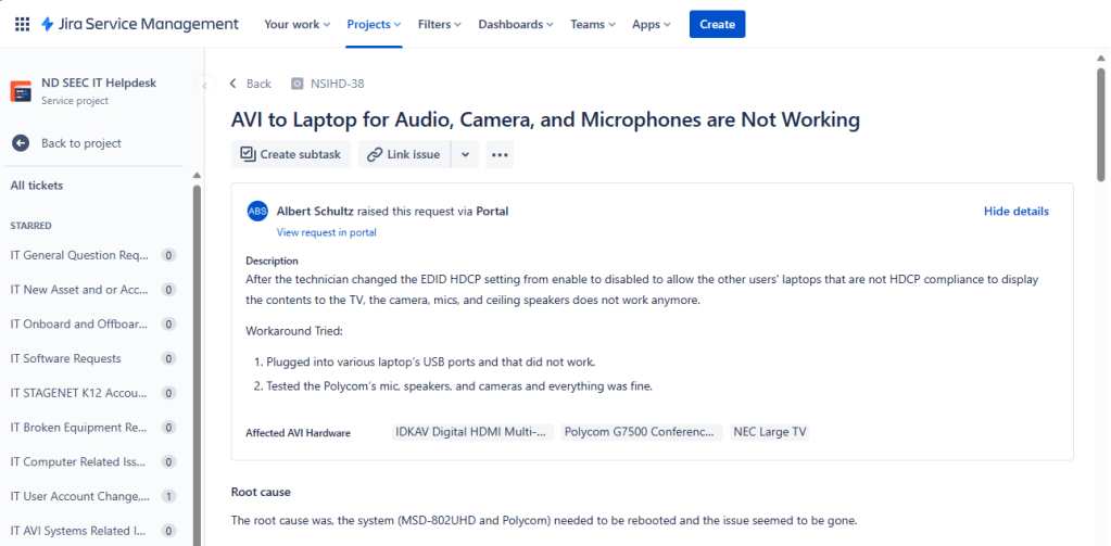 This took a good couple weeks to plan, design, test, and deployed the Jira Atlassian ITSM package for the internal team to utilize and create tickets within their own Jira Customer profile accounts. The planning consisted of reviewing the business needs, the cost, the numbers of IT personnel using the ITSM service desk, and the expandability of the ITSM as the non-profit continues to grow.
